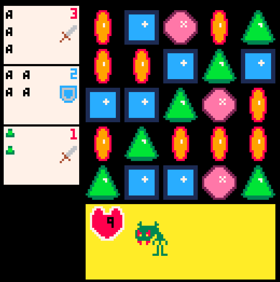 For the moment it only displays what items you have and allows to move pieces and play candy crush basically, but each combination damages an enemy or gives you armor (what cannot be seen as the enemies dont ever deal damage)